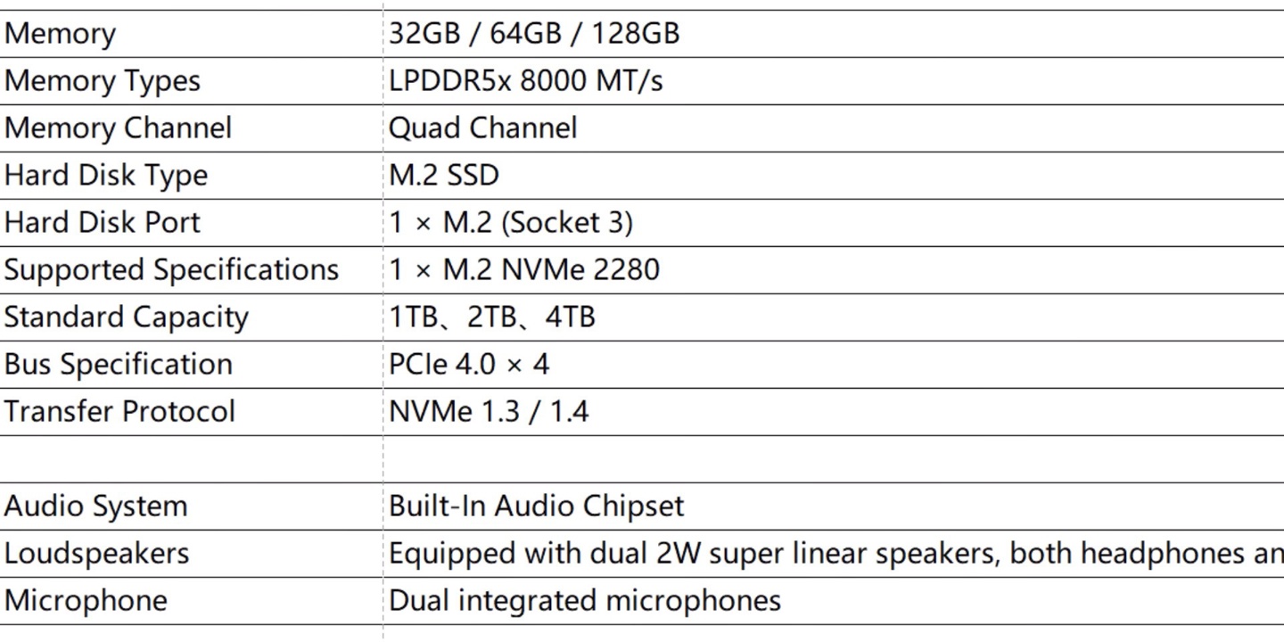 其在存储方面搭载 32GB / 64GB / 128GB LPDDR5x-8000 内存,提供 1 个 M.2 2280 PCIe 4.0×4 NVMe 固态硬盘位、1 个 SD 3.0 UHS-I 读卡器,此外还包含一个兼容佰维 Mini SSD 模块的专用槽(IT之家注:PCIe 4.0×1,1600MB/s 顺序读写)。