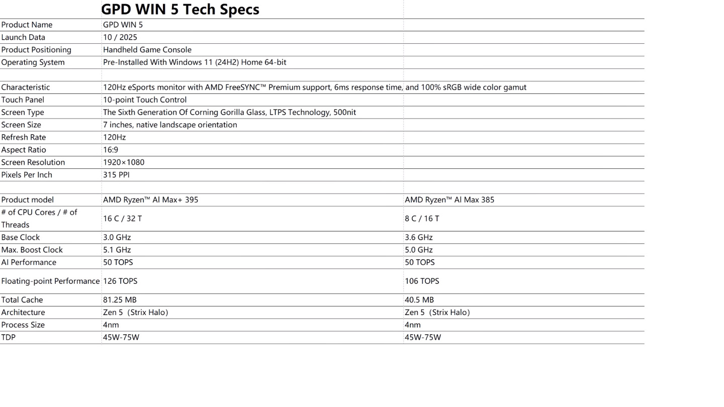 GPD WIN 5 可选旗舰 AMD 锐龙 AI Max+ 395 或低一些的锐龙 AI Max 385 处理器。后者 CPU 规格砍半到 8 核心但保留了 32CU 规模的 GPU,游戏性能损失相对较小,预计将成为更具性价比的选择。